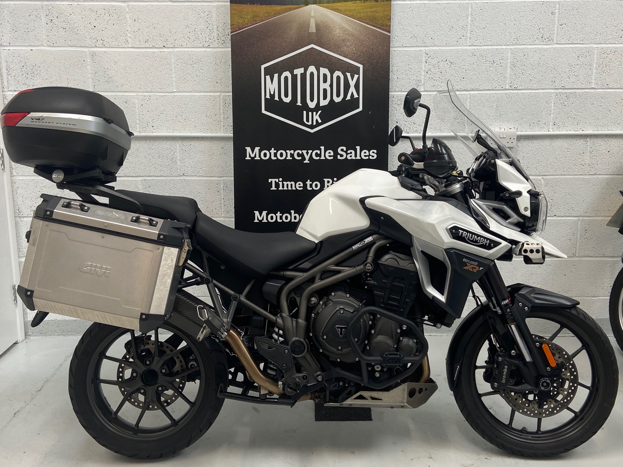 Triumph Tiger Explorer XRT 1200, 2016 (16) reg, Crystal White Metallic, 21889 miles, two owners, original owners pack including spare keys, manual, service book (5 Triumph dealer services) expensive 20k mile valve service carried out at 18627 miles, MOT until April 2026,new MOT included, semi active rear shock replaced in August 2023 (£1400), this is the top of the range road biased XRT model it comes with a massive specification as standard including Riding Modes, Traction control, ABS, Semi Active WP suspension, Cruise Control, Heated grips, Fog lights, Heated seats for Rider and Pillion, Electronic adjustable suspension, Electronic adjustable touring screen, Centre stand, Hand guards and LED indicators. This Tiger also has many extras including INNOVV Navigation & Camera System which includes front and rear cameras and supports popular applications via phone connectivity such as Google Maps, Maze, Spotify, etc via built-in Carplay, Android Auto., steel sump guard, Pyramid fenda extender and rear splash guard, radiator guard, engine bars, Scorpion exhaust and Givi Trekker Panniers along with a Givi Monokey top box. This is a superb road biased adventure bike that’s ready for some serious fun. 3 Month Warranty included, full HPI check, DVLA registration. ULEZ (LONDON EMISSION ZONE) COMPLIANT, GUARANTEED HPI CLEAR. There is a Finance Calculator at the bottom of the advert provided by Zuto. We also accept most major Credit and Debit cards and organise nationwide delivery. To ensure the bike is available to view please CALL AHEAD and then drop by to check out the bike. PLEASE CALL/EMAIL/TEXT/WHATSAPP US TO ARRANGE A TIME TO VISIT. Check out motobox.co.uk for all contact information.