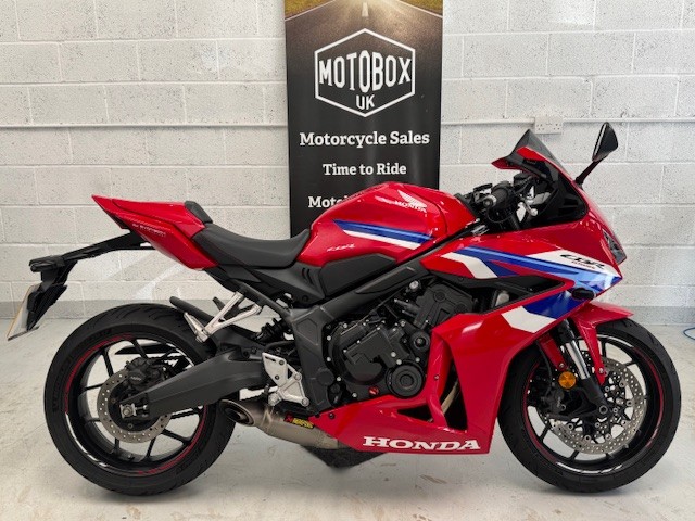 Honda CBR650 RAC-R Euro 5+, 2024 (24) reg, A2 COMPLIANT 35KW Restrictor fitted with certificate, Grand Prix Red (with HRC-style blue and white accents), Dealer plus one owner, 7360 miles, owners pack including spare key, manual, service invoice Maidstone Honda Sept 2025 @ 6081 miles, this bike comes with the Honda Racing Pack from new which includes a colour-matched pillion seat cover (pillion seat included) and tank pad, plus an oil level gauge and CBR-branded tank side pads, additional extras Akrapovic exhaust (original included), dark tint screen (original included), Oxford heated grips, R&G bar ends and Evotech frame sliders. This is a superb looking bike and will not disappoint. 3 Month Warranty included, full HPI check, DVLA registration. ULEZ (LONDON EMISSION ZONE) COMPLIANT, GUARANTEED HPI CLEAR. There is a Finance Calculator at the bottom of the advert provided by Zuto. We also accept most major Credit and Debit cards and organise nationwide delivery. To ensure the bike is available to view please CALL AHEAD and then drop by to check out the bike. PLEASE CALL/EMAIL/TEXT/WHATSAPP US TO ARRANGE A TIME TO VISIT. Check out motobox.co.uk for all contact information.