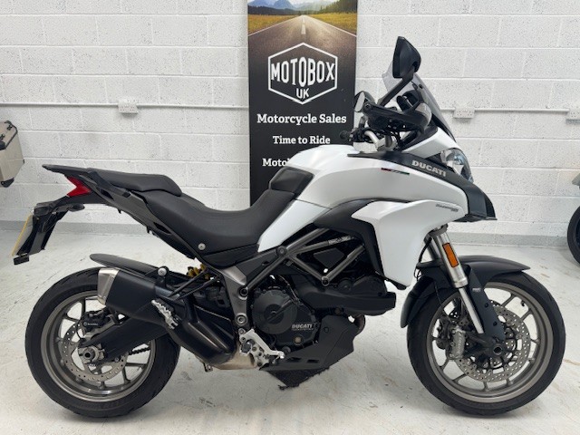 Ducati Multistrada 950, 2017 (17) reg, Star White Silk, 16246 miles, 3 owners, comes with original pack including spare key, manuals, service book (6 dealer services) , Desmo and belt service just carried out by Ducati London at 16236 miles (Desmo service not due now for another 18k miles), recent Michelin Road 5 Trail tyres, comes as standard with four rider modes; Sports, Touring, Urban and Enduro which automatically change the power and engine characteristics along with the ABS and traction control, Ducati Safety Pack which includes three-way ABS and eight-way traction control. There’s fully adjustable suspension front and rear, a manually adjustable screen and impressive Brembo brakes at both ends. Check out the walk around video in the gallery. Price includes a 3 MONTH WARRANTY (extended warranties available), full HPI check, DVLA registration. ULEZ (LONDON EMISSION ZONE) COMPLIANT, GUARANTEED HPI CLEAR. We also accept most major Credit and Debit cards and organise nationwide delivery. To ensure the bike is available to view please CALL AHEAD and then drop by to check out the bike. PLEASE CALL/EMAIL/TEXT/WHATSAPP US TO ARRANGE A TIME TO VISIT. Check out motobox.co.uk for all contact information.